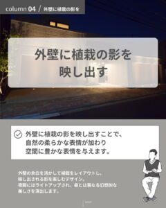 立体感のある空間になります。余白の中に光を散りばめるような照明計画が夜の外構を一層魅力的に見せます。