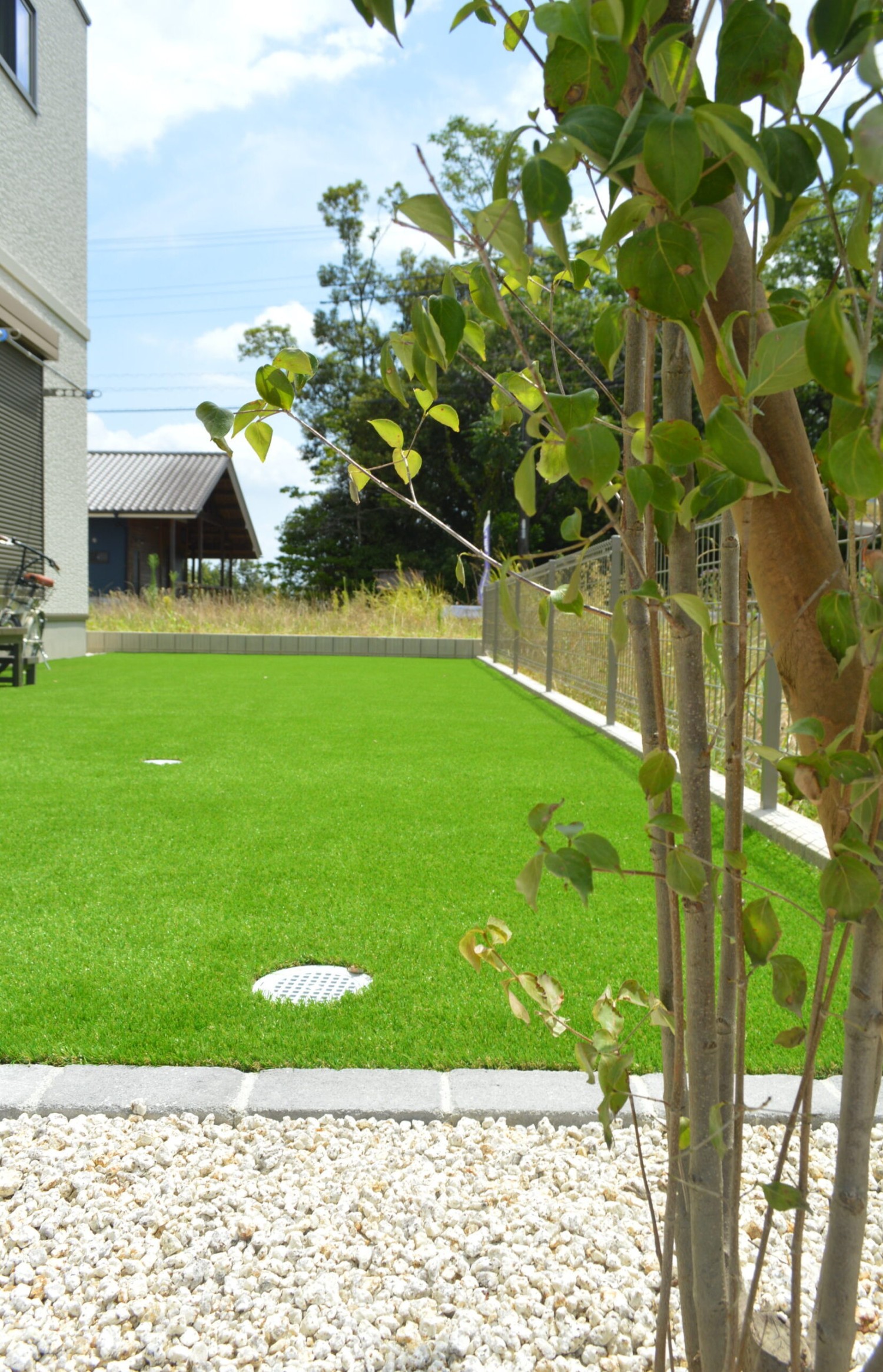 人工芝は、見る方向によって色味や質感が少し違って見えるんです。