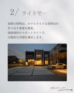 ホテルライクな外構の魅力は、昼だけではありません。