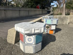 外にあったイスも一つ一つ違うタイルが貼られていて