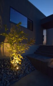 足元を優しく照らす間接照明や、植栽を下から照らすスポットライトは、