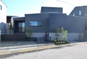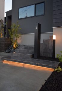 黒系の外壁が際立つモダンな住宅に合わせ、外構も全体的に落ち着いた雰囲気で統一しました。ポイントは“住まいと外構をトータルでコーディネートすること”。建物と調和したデザインにすることで、外から見たときの印象がグッと引き締まり、シンプルでありながら上質な佇まいを感じさせる空間を演出できます。