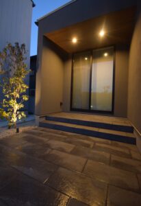 昼とはまったく違う表情を見せてくれる、夜の外構。