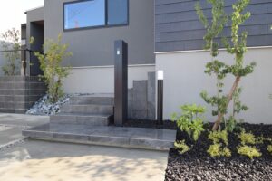 黒系の外壁が際立つモダンな住宅に合わせ、外構も全体的に落ち着いた雰囲気で統一しました。ポイントは“住まいと外構をトータルでコーディネートすること”。建物と調和したデザインにすることで、外から見たときの印象がグッと引き締まり、シンプルでありながら上質な佇まいを感じさせる空間を演出できます。