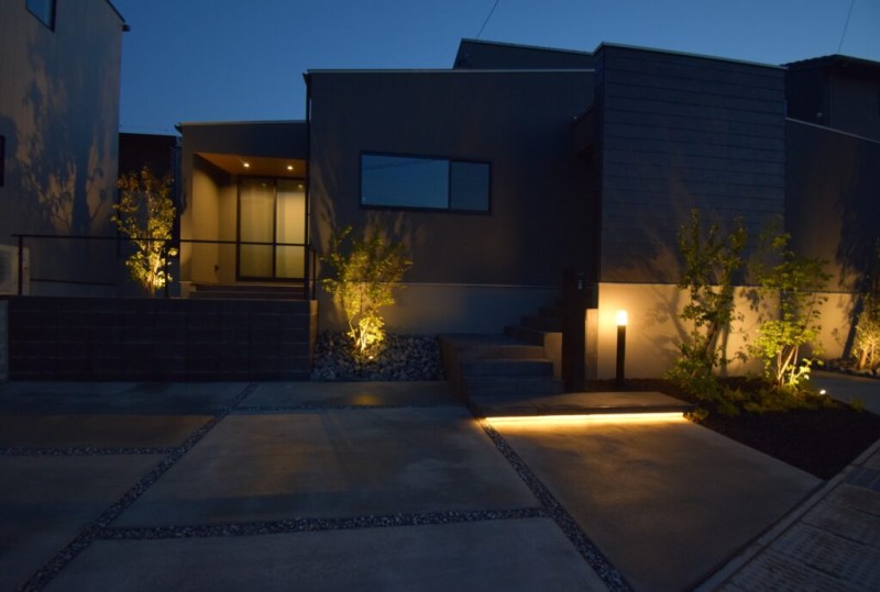 昼とはまったく違う表情を見せてくれる、夜の外構。